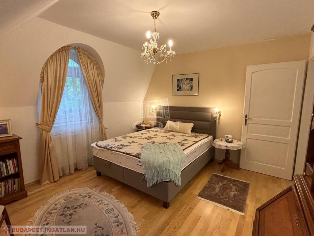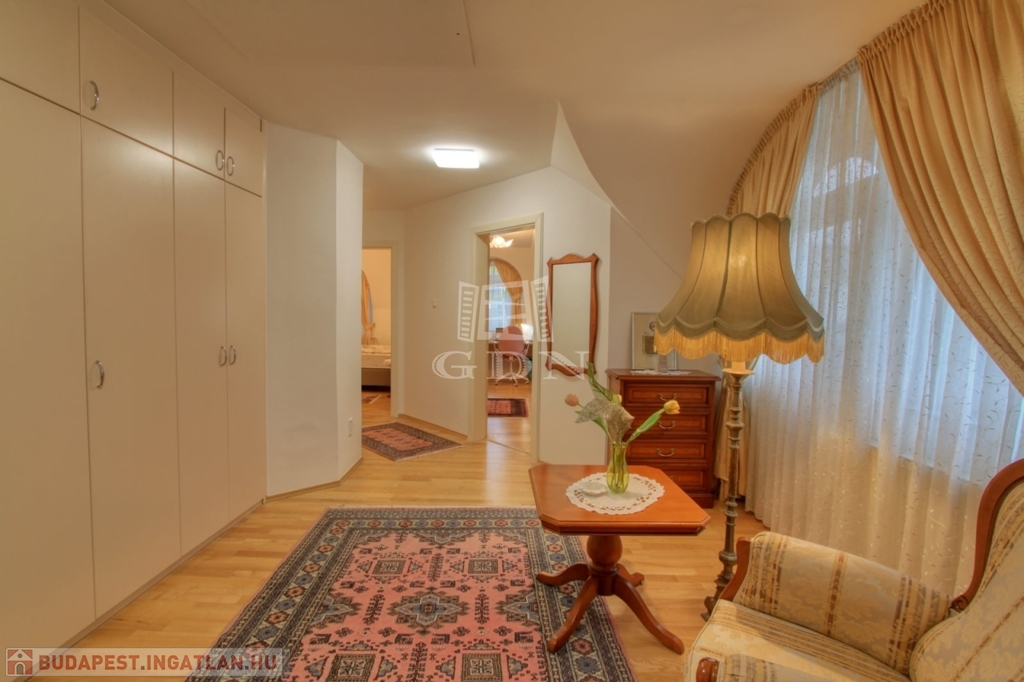 Az emeleti szinten a kör alakú galéria térből juthatunk egy 15 m2-es gardrób szobán keresztül 2 db hálószoba felé (ahol az egyik hálószobához erkély kapcsolat és zuhanyzós fürdőszoba tartozik), illetve a fő hálószoba és dolgozószoba irányába. A fő hálószobából tágas, walk-in zuhanyzóval, pezsgőfürdős káddal rendelkező fürdőszoba nyílik.