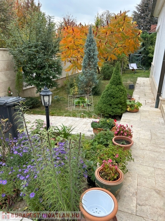 A gondosan megtervezett, ápolt kertet szép növényzet díszíti, a kerti szerszámok tárolására egy kis faház biztosít helyet.