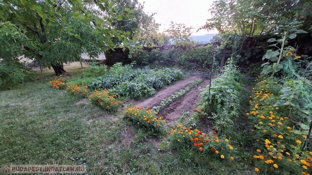 A hatalmas kert igazi kincs: cseresznye, meggy, alma, szilva, ringló, dió, füge, szőlő és mogyoró terem benne, mindez IBC tartályos esővízgyűjtővel és automata öntözőrendszerrel támogatva. Ipari áram bekötése is megtörtént.