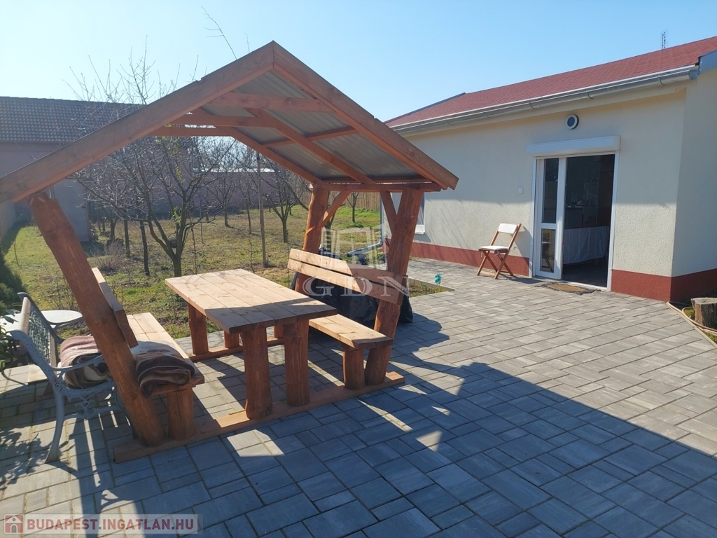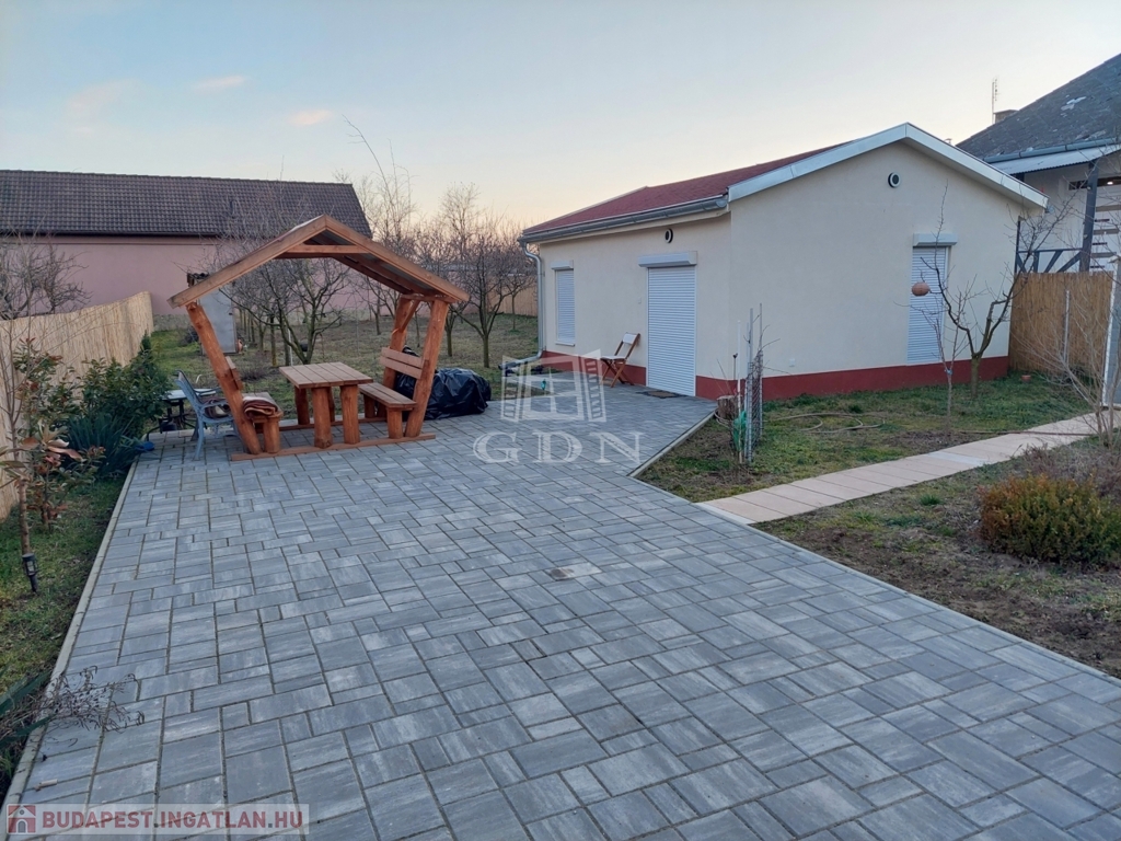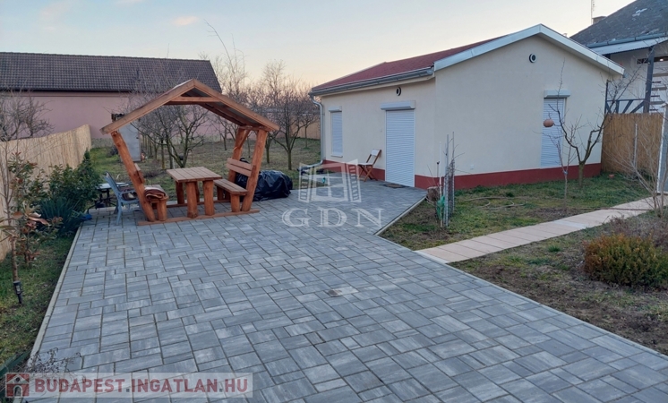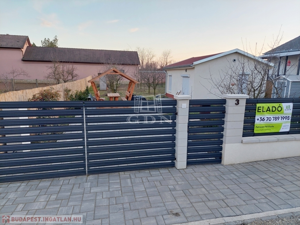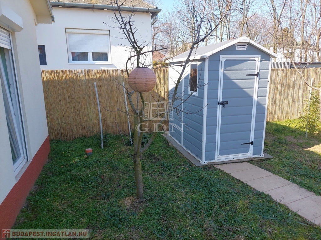Az előkert részén helyezkedik el egy új kerti szerszámtároló, illetve itt lehet létrehozni egy kis konyhakertet is. A szépen gondozott hátsó kertben fiatal gyümölcsfák találhatók és ezen a területen, szükség esetén a ház további bővítése is lehetséges. A környék kifejezetten csendes, nyugodt kertvárosias. Bár az ingatlan előtt jelenleg még murvával borított út található, de a két szomszédos utca felől aszfaltozott úton közelíthető meg.