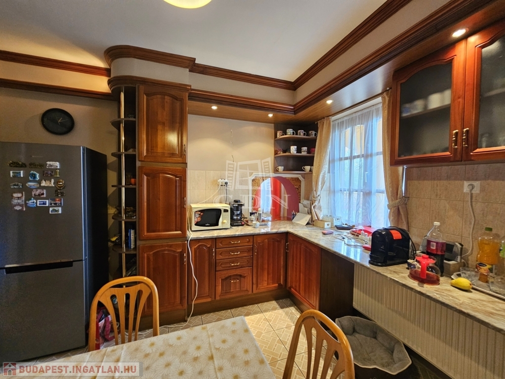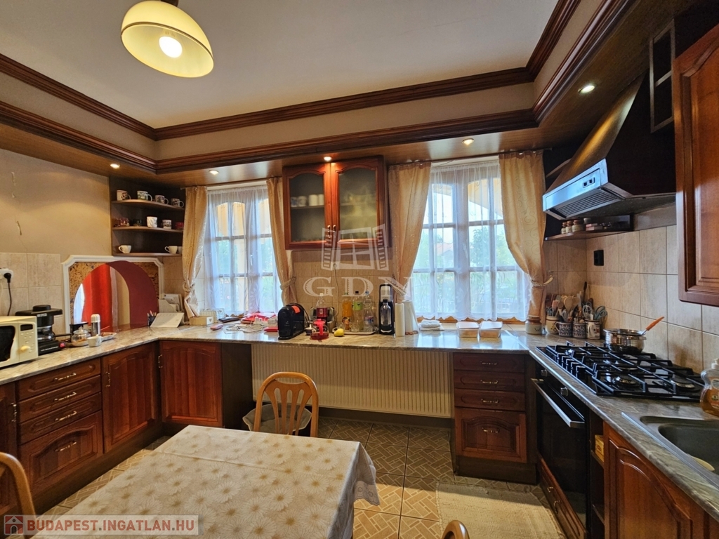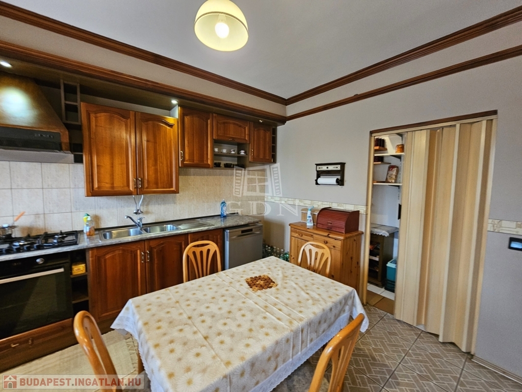 A konyha világos, elegáns kivitelű, praktikusan elrendezett, teljesen gépesített, az étkezővel átadó pulttal is össze van kötve. Az étkezőrész és a nappali tágas, a rajta található tolóajtón keresztül a nagy teraszra is ki lehet ülni.