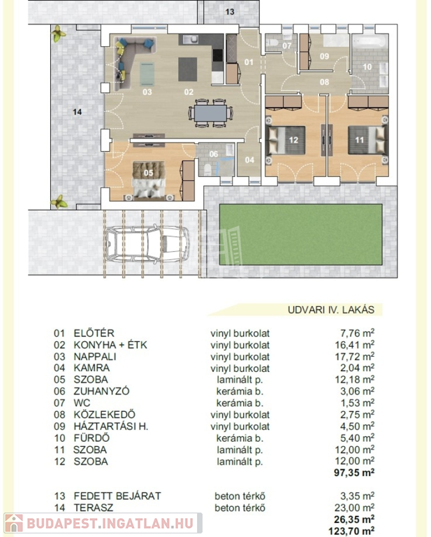 Burkolatok: Vinyl és laminált padlók, kopásálló hidegburkolat, burkolati keret: 5.000 Ft/m²-ig választható
