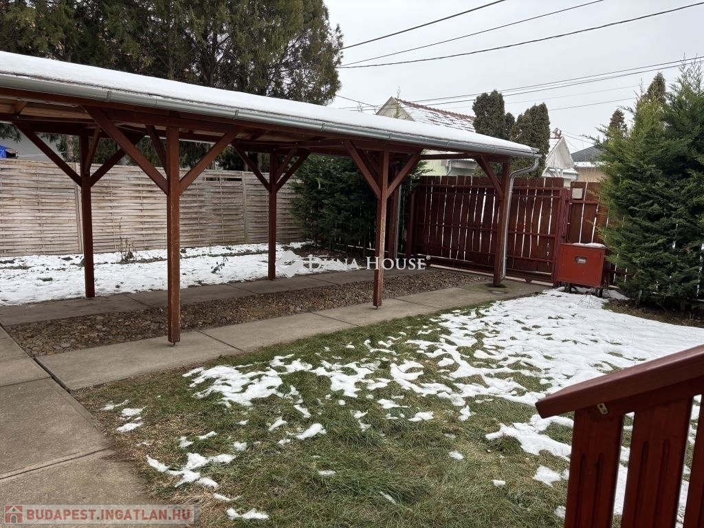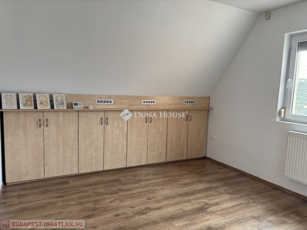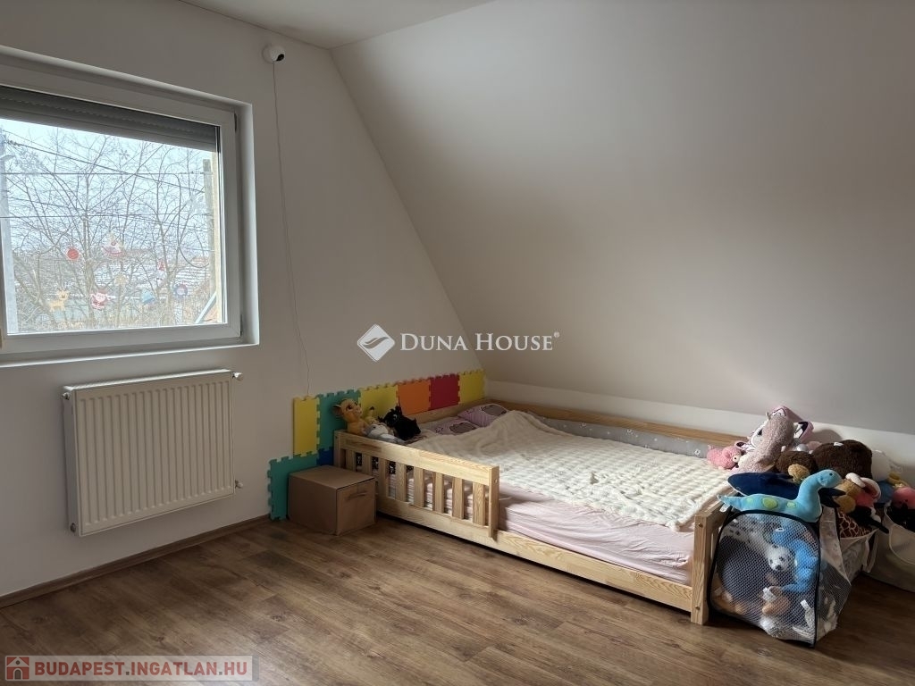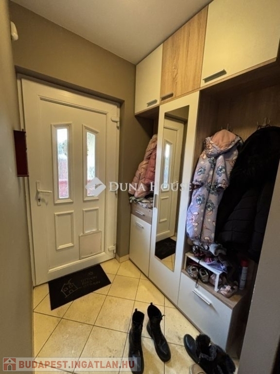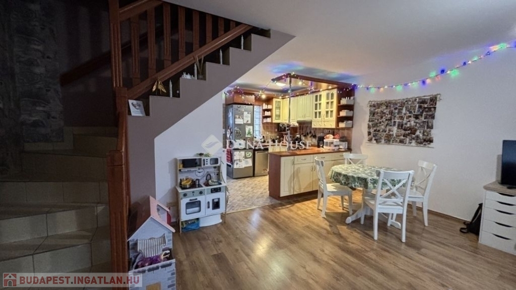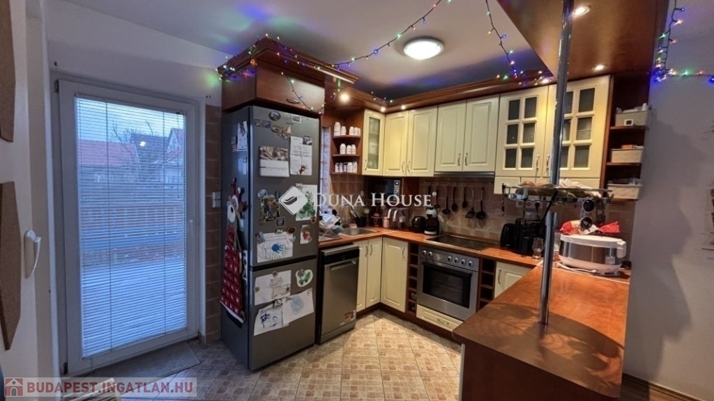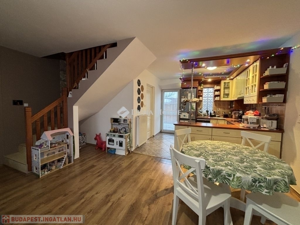 Eladó Pest-megyében, Üllőn, 294 nm-es, összközműves telken, egy 2006-os építésű, 64 nm-es, nappali + 2 szobás, tetőtér beépítéses Ikerház fél.Az épület 2006-ban épült, beton alapra, tégla falazattal, beton födémmel, cseréppel fedett tetővel. A falazatra egységes, 10 cm-es dryvitos hőszigetelés került. A nyílászárók hőszigetelt üvegezésű, műanyag szerkezetek, redőnnyel és szúnyoghálóval szerelve.A lakás földszinti részén szélfogó, előszoba, nappali, konyha, fürdő, a tetőtérben közlekedő és két háló található. A hátsó kert kívülről és a konyhából nyíló ajtón keresztül a teraszon át is megközelíthető.A nappali és a szobák laminált parkettával, a többi helyiség és az emeletre felvezető beton lépcső is, járólappal fedett.A konyhabútor a gépészettel, és az elszívóval együtt a vételár részét képezi.A fűtésről és a használati meleg víz-ellátásról kombi cirkó gondoskodik, a hőleadók lapradiátorok. A tetőtérben hűtő-fütő klíma berendezés emeli a komfortérzetet. Az ingatlan mozgásérzékelőkkel, riasztóval szerelt.A 845 nm-es önálló telken 3 önálló egységet alkotó ingatlan található. Az eredeti épület egy régebbi építésű családi ház. A porta megosztásra került és 2006-ban, egymáshoz képesti eltolással két ikerház épült, melyből most az egyik eladó.Az eladásra kínált ingatlan természetben is és jogilag is teljesen független a többitől. Az iker szomszéddal közös falra 7,5 cm vastagságú Halltex hangszigetelő rendszer került.Saját használatú, lekerített, 294 nm-es kerttel rendelkezik. A telek növényekkel beültetett, melyben fúrt kút és automata öntözőberendezés szolgálja a tulajdonosok kényemét. A kertben elől két autó számára kialakított fedett kocsibeálló, és a kerti szerszámok tárolására alkalmas kis tároló található.A gépkocsibeálló kamerával megfigyelt, valamint az elektromos kapu elő lett készítve.A beépített bútőrok a vételár részét képezik!