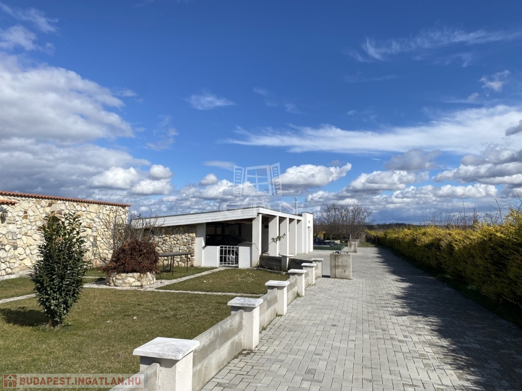 A telek 7698m2-es, teljesen körbekerített. A gépjárművel való bejutás elektromos kapun keresztül biztosított. Az udvaron található egy 4 állásos autóbeálló, egy nyári konyha-dühöngő, illetve egy medence is. A telek ¾ része jelenleg csak füvesített, a fennmaradó rész teljesen parkosított, örökzöldekkel beültetett közel 700m2 része teljesen térkövezett. Található rajta egy kút is, ami bő vízhozamának köszönhetően lehetőséget ad a kert locsolásához is.