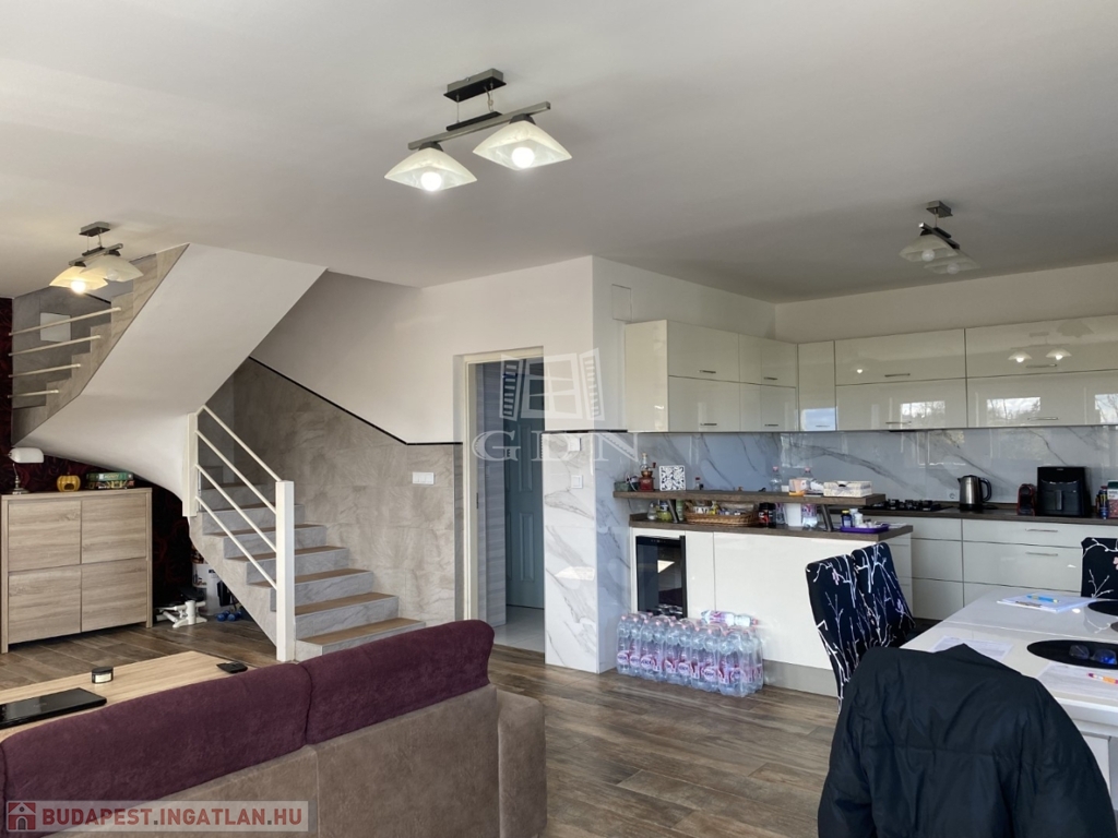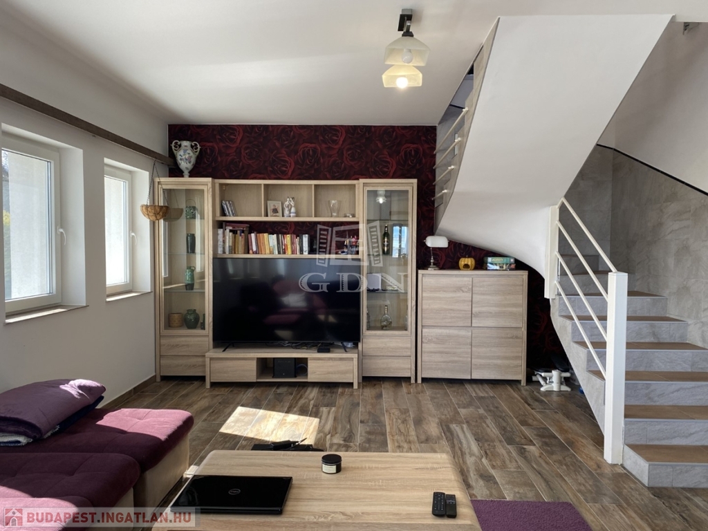 Az épület hátsó oldalán egy lakrész került kialakításra. Elosztását tekintve 120m2 hasznos alapterületű. A földszinten egy előszoba, amerikai konyhás nappali, fürdőszoba WC-vel, a tetőtérben pedig 4 hálószoba található.