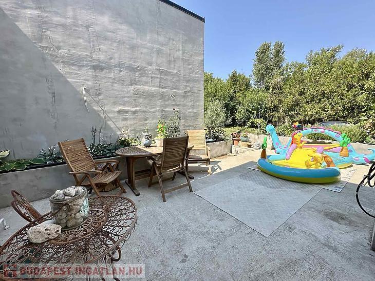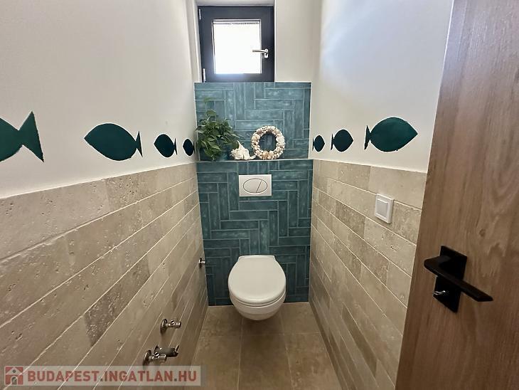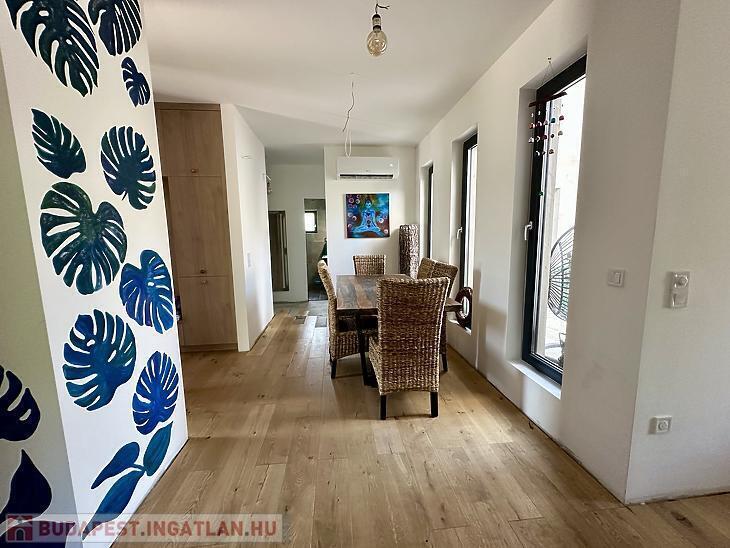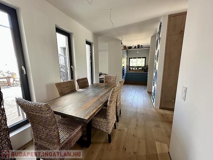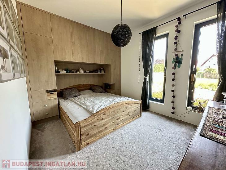 A belső elrendezés rendkívül praktikus: előszoba, étkező, konyha, tágas nappali, három hálószoba, mosókonyha, egy fürdőszoba WC-vel, valamint egy fürdőszoba és egy különálló WC is megtalálható benne. A nappaliból közvetlen kijárat nyílik a 48 nm-es teraszra, amely ideális helyszíne lehet a családi és baráti összejöveteleknek. A ház nagy része már elkészült, azonban néhány kisebb befejezendő munkálat lehetőséget ad arra, hogy az új tulajdonos saját igényei és ízlése szerint alakíthassa ki az otthonát. A délkeleti tájolásnak köszönhetően a ház egész nap világos, napfényes tereket kínál, ami tovább növeli az otthonos hangulatot.