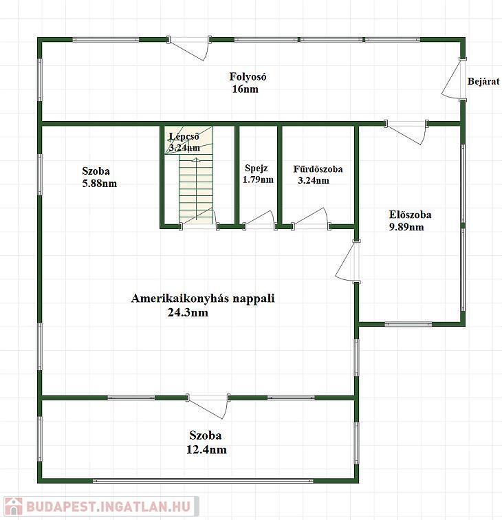 Az alsó szinten tágas előszoba, közlekedő, amerikai konyhás nappali, egy külön szoba, fürdőszoba és spejz található.