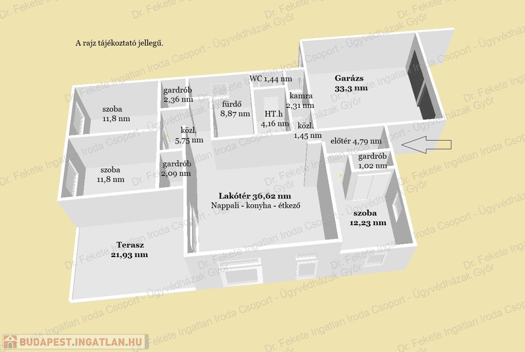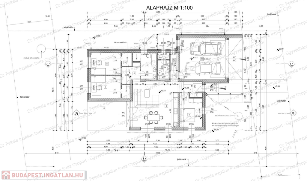 106,69 nm lakótér-nappali +3 szoba, + 33,3 nm-es fűtött, dupla garázs, terasz + 21,93 nm. Telek: 654   nm.
