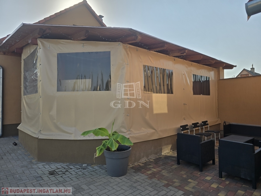 Az ingatlan egy 903 m²-es telken helyezkedik el, amelynek csaknem 70%-a térkővel burkolt, így minimális karbantartást igényel, ugyanakkor esztétikus és jól használható udvart biztosít. Az elektromosan működtethető új kapu kényelmes bejutást biztosít, a gyalogos bejáratnál kamera gondoskodik a biztonságról.
