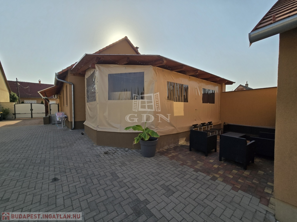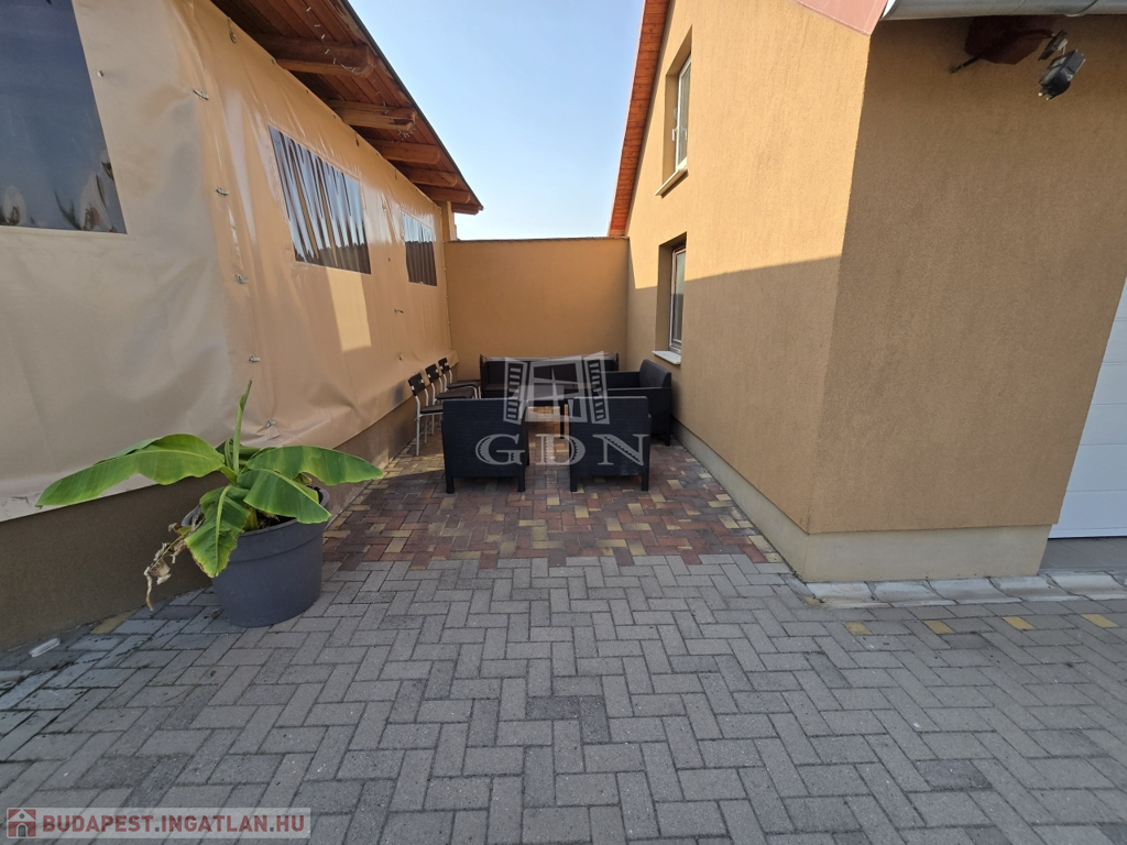 Az ingatlan egy 903 m²-es telken helyezkedik el, amelynek csaknem 70%-a térkővel burkolt, így minimális karbantartást igényel, ugyanakkor esztétikus és jól használható udvart biztosít. Az elektromosan működtethető új kapu kényelmes bejutást biztosít, a gyalogos bejáratnál kamera gondoskodik a biztonságról.
