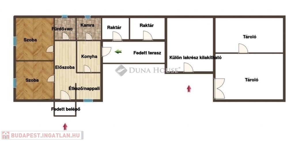 Kialakítása: 2 tágas utcafronti szoba, közlekedő, étkező, konyha, fürdő+wc, kamra, tágas fedett terasz. További raktár és műhely az udvaron, tároló és gépkocsibálló.