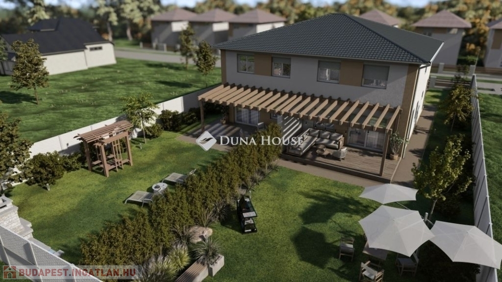 Eladó Vecsés Felsőhalmon egy 147 nm alapterületű, nappali+ három halószobás, belső kétszintes, 424nm-es saját kerttel, garázzsal, hőszivattyús fűtéssel rendelkező, újépítésű ikerház egyik fele.