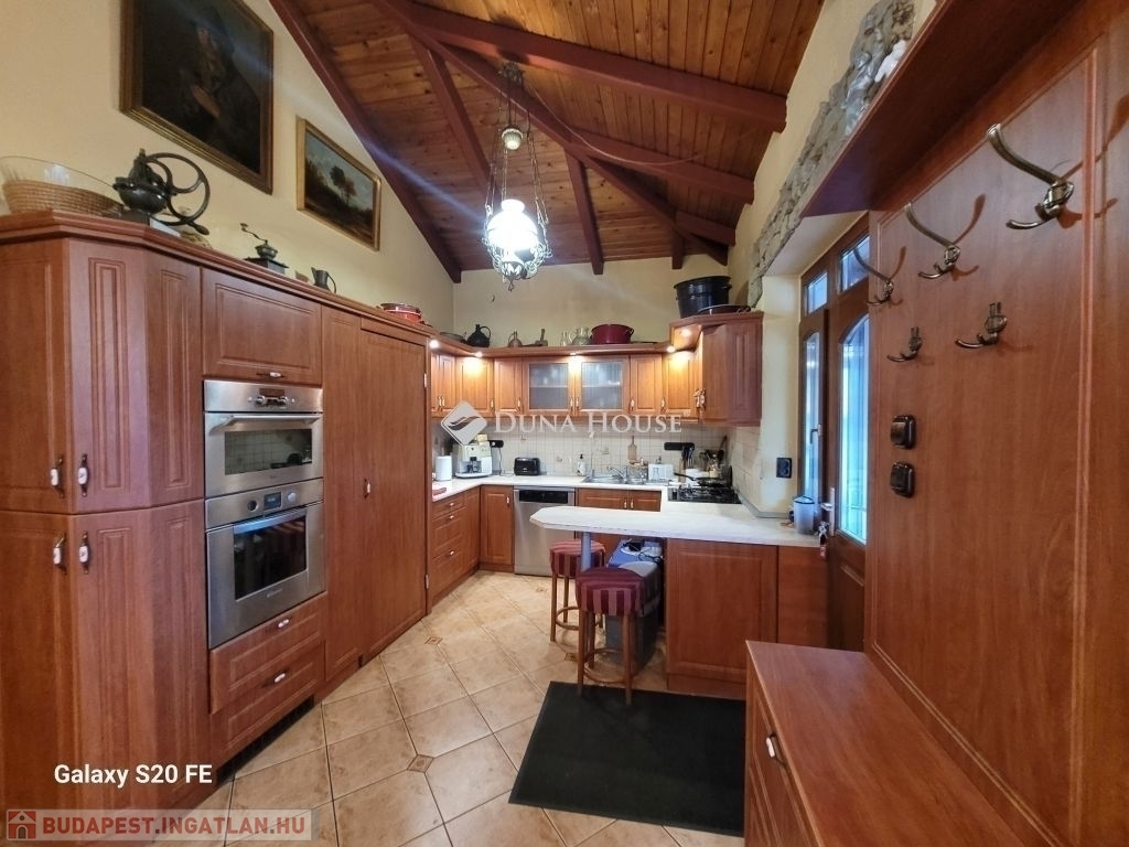 A földszint központi eleme az a tágas, amerikai konyhás étkező-nappali, amely egyszerre modern és időtálló. A profi beépített konyhabútor és gépek nem csupán a funkcionalitást, hanem a dizájnt is szolgálják a tér minden szögéből látszik, hogy ez egy valóban átgondolt, minőségi kialakítás.