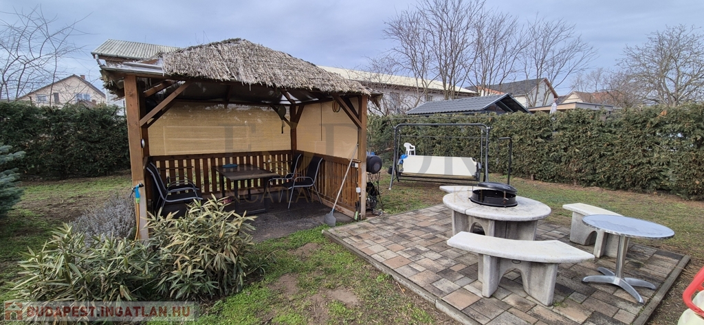 A telek hátsó, füves részén egy fedett, beülős kis faház és egy kőből épített sütögető szolgálja a családi és baráti összejöveteleket – egy valódi, meghitt kertkapcsolatos élettér, ahol a hétköznapok is ünneppé válhatnak.