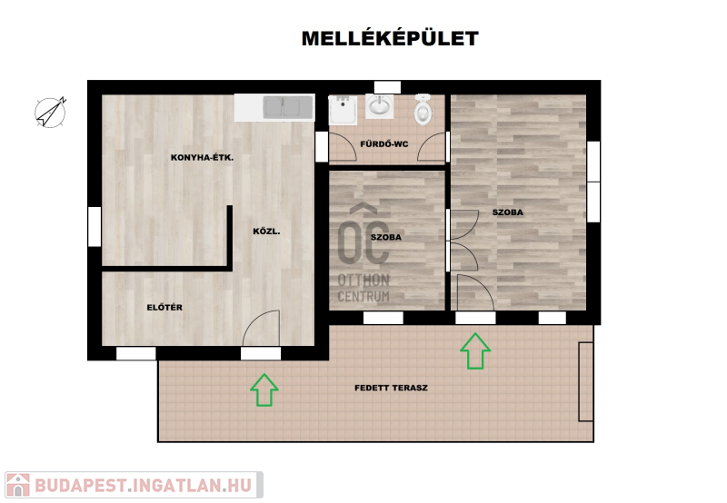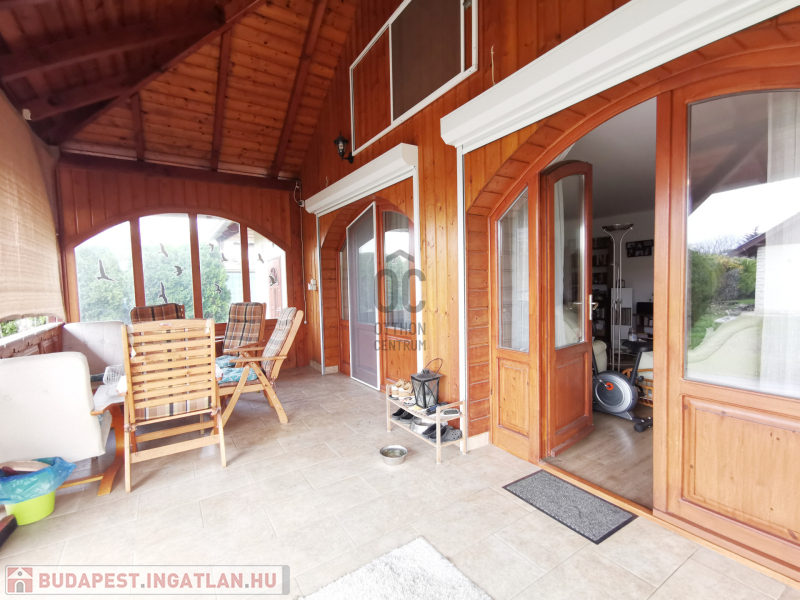 Nagy fedett terasz, 2 szoba, konyha-étkező, fürdőszoba épült egyidőben a főépülettel.