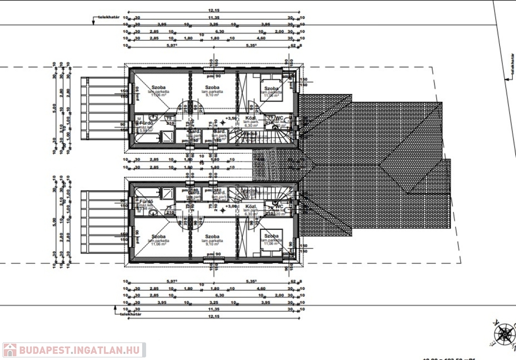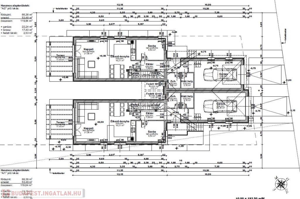 Mindkét ikerház fél nettó 120 nm hasznos alapterületű két szintes épület + mindegyikhez tartozik egy-egy garázs és tároló. A házrészek itt kapcsolódnak egymáshoz.