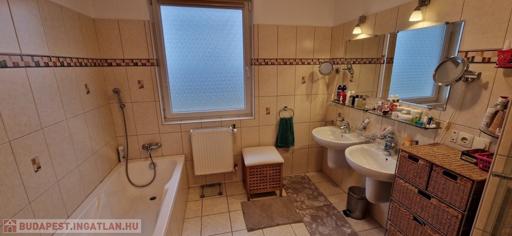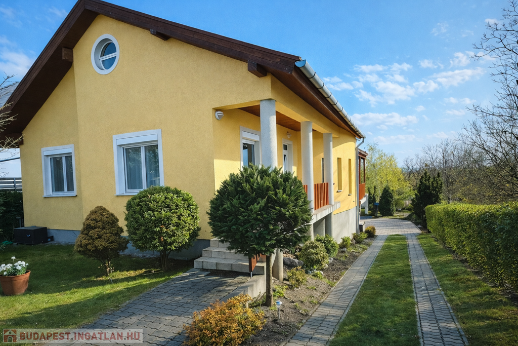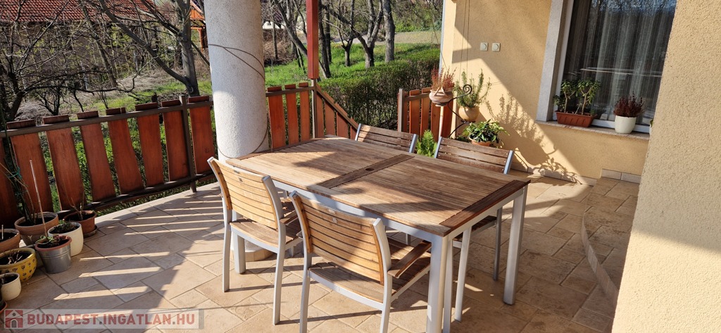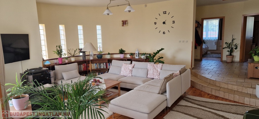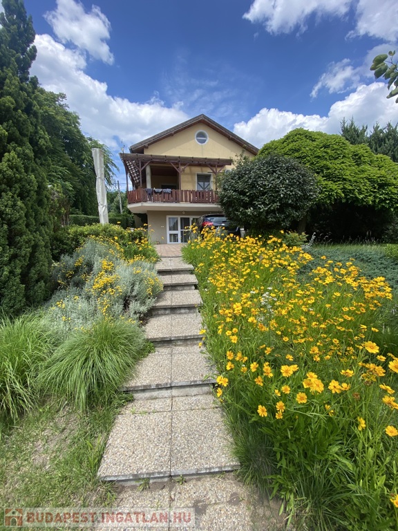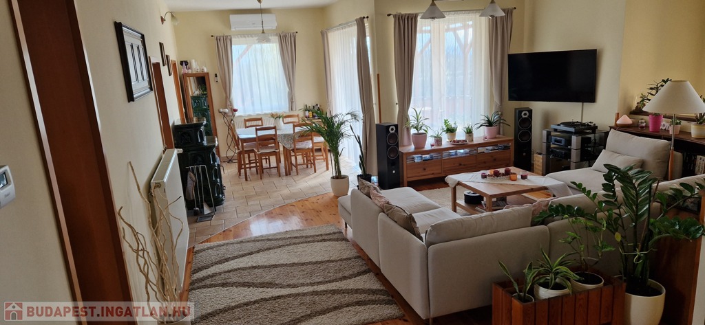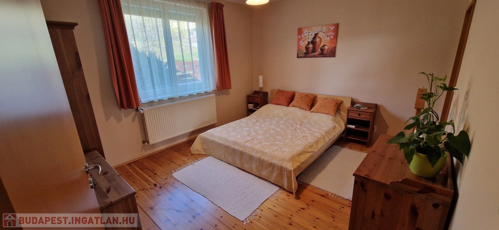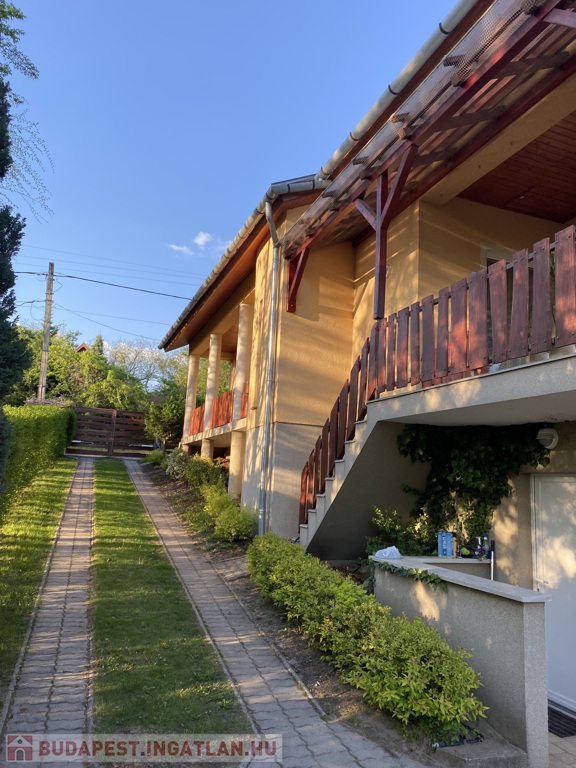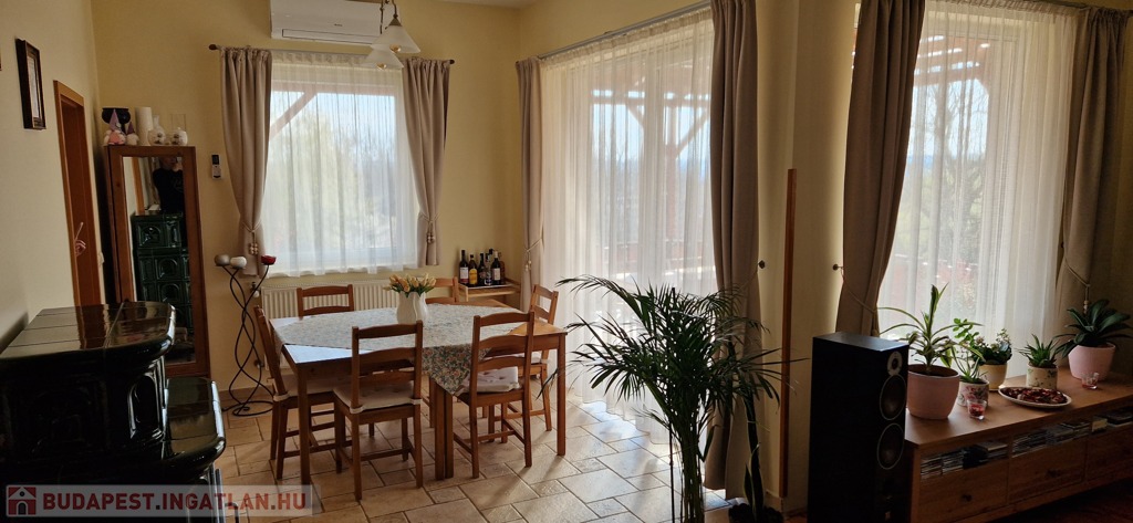 Ingatlan leírása: a szépen karbantartott ház két szinten, 195 nm területü. A földszinten található 3 hálószoba, 1 nagy, világos nappali, 1 gépesített konyha, 1 fürdőszoba (káddal és zuhanyzóval) és 1 különálló WC. A nappaliban hűtő-fűtő klíma és egy kis cserépkályha is található. A félszuterén használható akár önálló lakrészként (idősebb szülő(k) részére, kamasz gyermek részére, aki szeretne egy kicsit önállóan, de mégis a szülők közelében élni, konditeremként, tároló helységeknek, üzletnek, műhelynek, kiadható, stb.) A félszuterén – mely a telek lejtős jellege miatt földszinti, teljes értékű szintnek tekinthető - jelenleg egy szép, világos nappaliból (kétszárnyú, kertre néző ajtókkal), konyhából (teljes értékű, világos ablakkal), fürdőszobából (ablakkal), és 2 tárolásra alkalmas helységből áll. A félszuterén megközelíthető lakáson belülről és kívülről is attól függően, hogy milyen célt szolgál. Jelenleg teljes értékű lakóhelyként funkcionál.