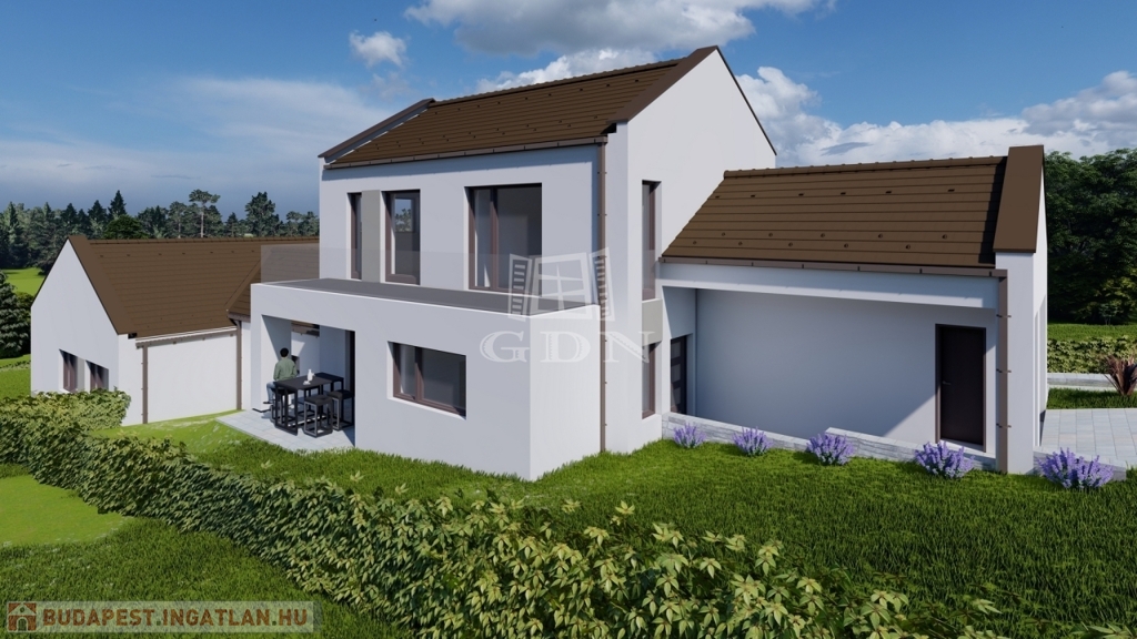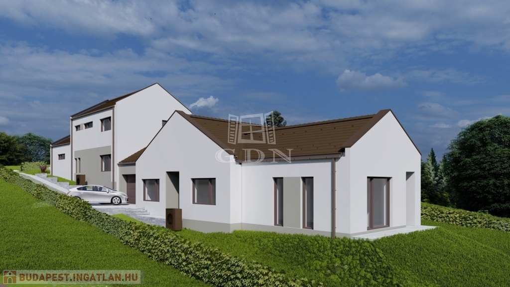Veresegyház, Hegyek városrész csendes, kertvárosias részén, cca. 450 nm-es telek területtel, Új építésű, bruttó 181 nm-es, 4 szobás (nappali + 3 hálószoba, külön konyha, étkező), két szintes, vasbeton födémes (az emeleten is), hőszivattyús (levegő - vízes) padló fűtéssel, Dél - Keleti fekvésű, műanyag thermo dió színű (3 rétegű, 7 légkamrás) nyílászárós, szigetelt (15 cm dryvit), új építésű, a másik féltől teljesen elszaparált, garázzsal elválasztott, a másik lakóegységgel egy telken lévő családi ház (első) eladó.
