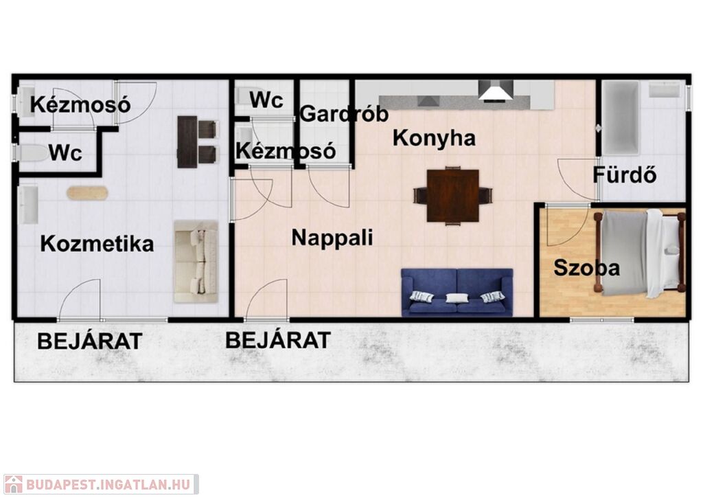 -60nm-es ingatlan(17nm-es kozmetikai szalon(wc-vel és kezelő helyiséggel),amerikai konyhás nappali, lakószoba, fürdőszoba, gardrób és külön wc)