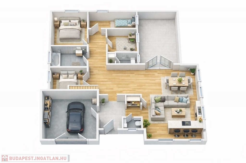 - Földszint: amerikai konyhás nappali, étkező, szülői háló privát fürdőszobával