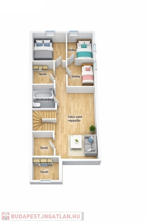 - Emelet: több hálószoba és egy galériás tér – dolgozószobának, játszószobának vagy második nappalinak is ideális