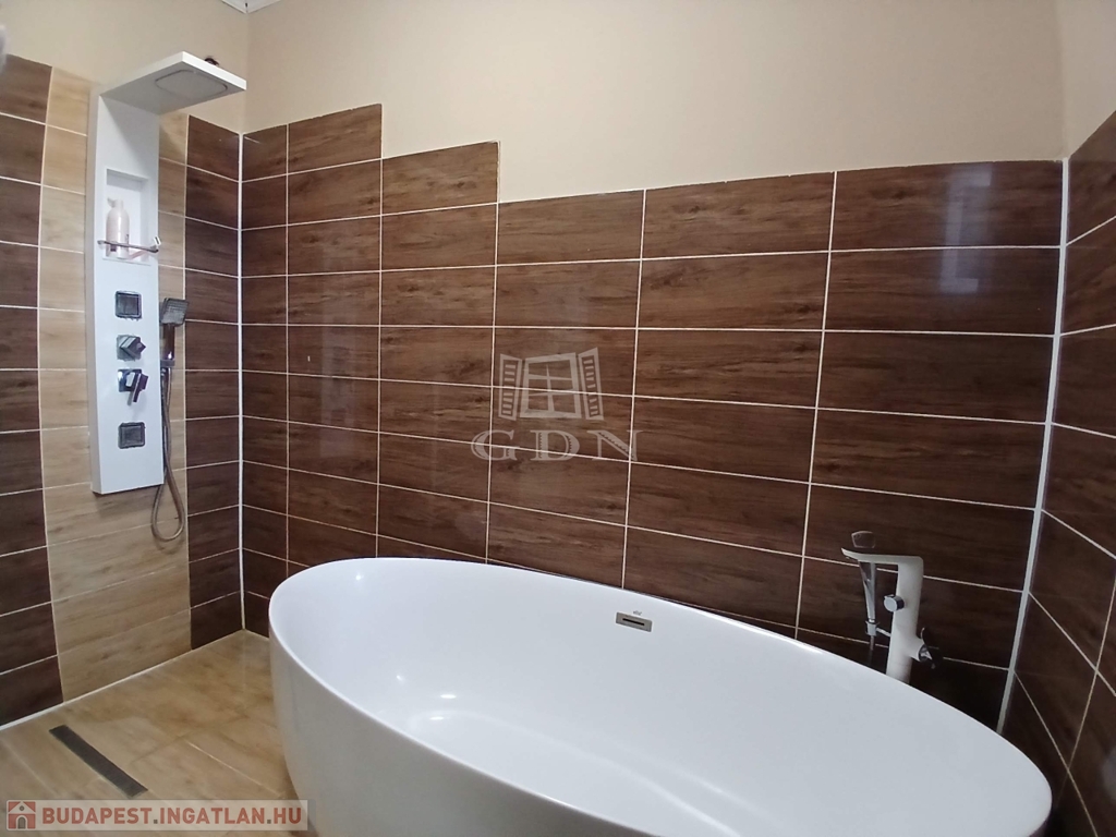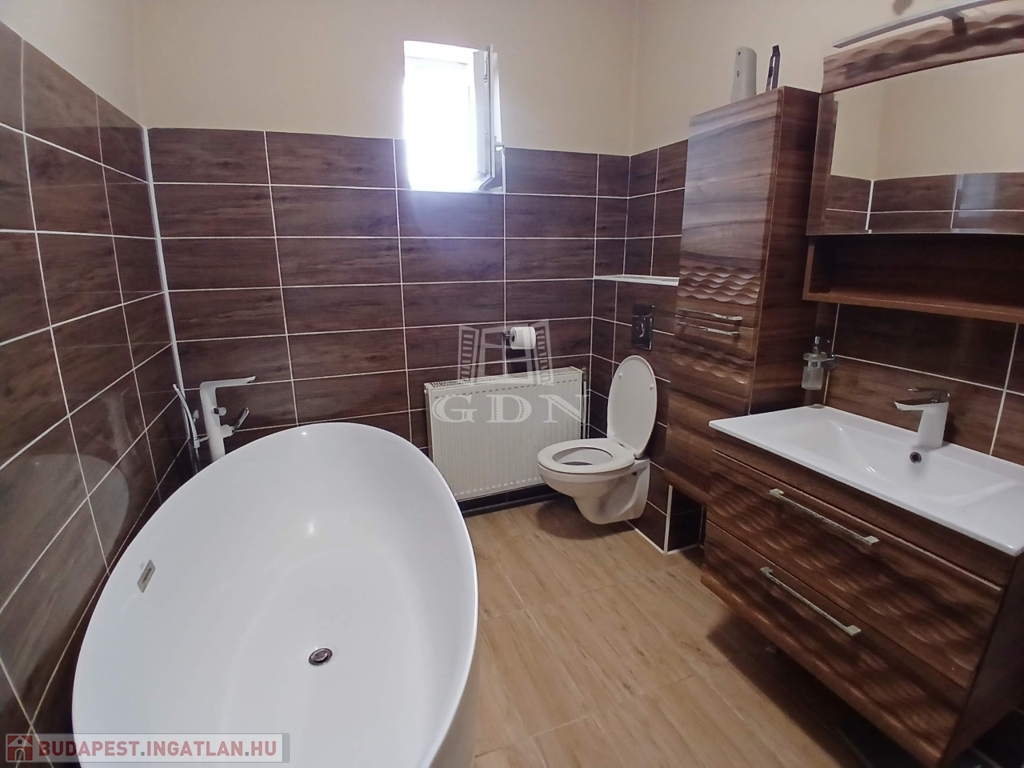 • felújított, modern stílusú fürdőszoba szabadon álló, ovális káddal