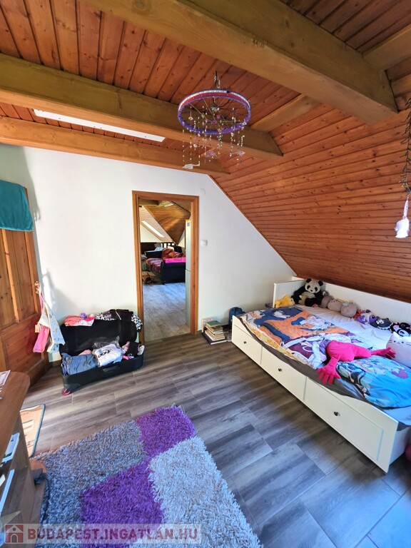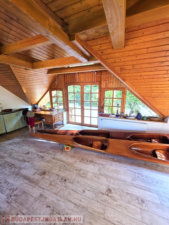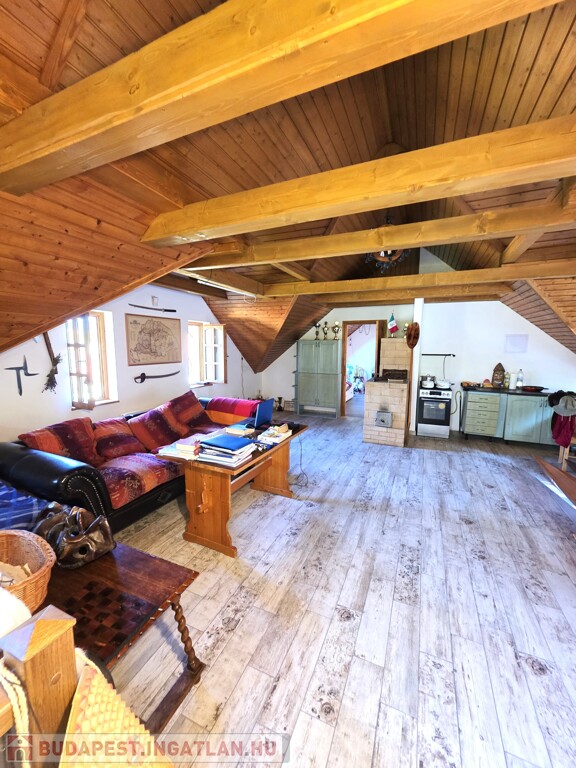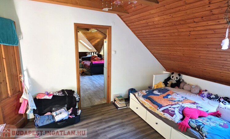 Tetőtér: Tágas nappali, jelentleg itt található a konyha, innen nyílik a fenti hálószoba, onnan pedig a fürdőszoba. Az emeleten található egy igen nagy terasz, ahonnan a kert első és hátsó felébe is lesétálhatunk.