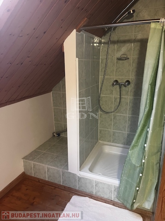 Fürdőszobájában zuhanykabin, wc,mosdókagyló és falraszerelt hajszárító van beépítve.