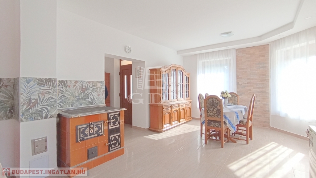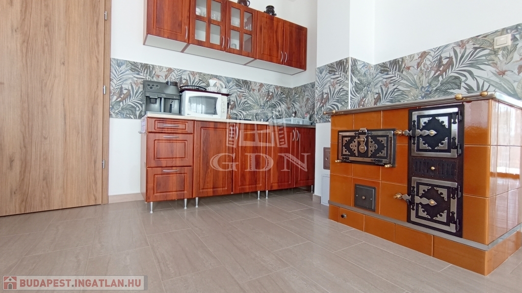 Másodlagos fűtésként egy 7 kW-os impozáns cserépkályha áll rendelkezésünkre, a mindössze 6 kW -os hőigényű ingatlanban.