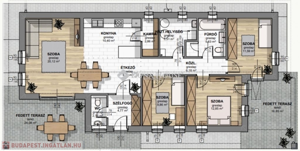 Az ingatlan 3 szoba + nappali elrendezésű, a terasz kellemes lehetőséget biztosít pihenésre, valamint a nappali természetes meghosszabbításaként szolgál a jó időben.