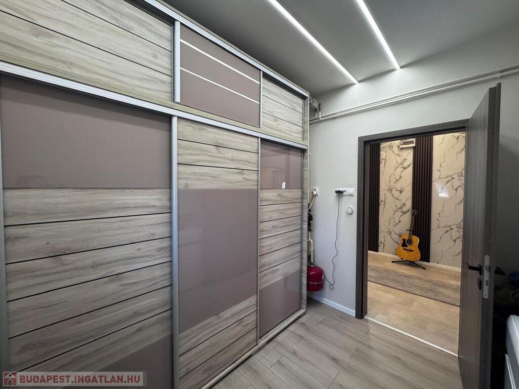 A külön gardrób helyiség új, tolóajtós beépített szekrényekkel még praktikusabbá teszi a mindennapokat.