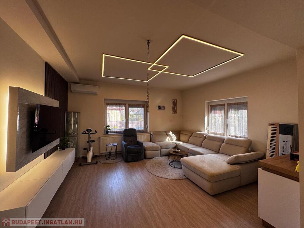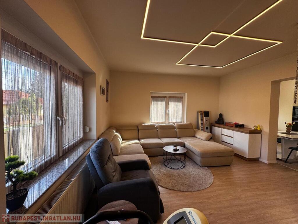 A belső terek kialakítása tágas, modern és kényelmes, ahol a funkcionalitás és az otthonos hangulat tökéletesen találkozik. Az ingatlan központi része a tágas amerikai konyhás nappali + étkező, ahol az új, gépesített konyhabútor, az igényes burkolatok és a kellemes térérzet igazán élhető otthont teremtenek.