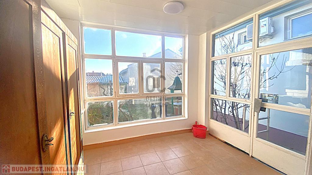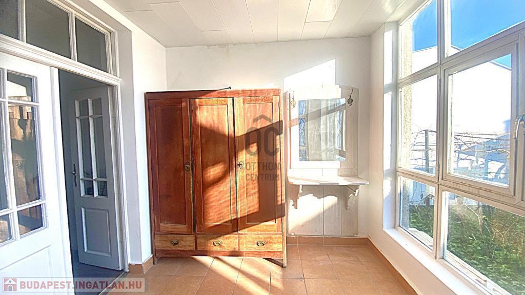 Eladó egy 104 m²-es polgári stílusú ház, 2 tágas szobával, nappali-étkezővel, konyhával, télikerttel és kis, könnyen gondozható kerttel.