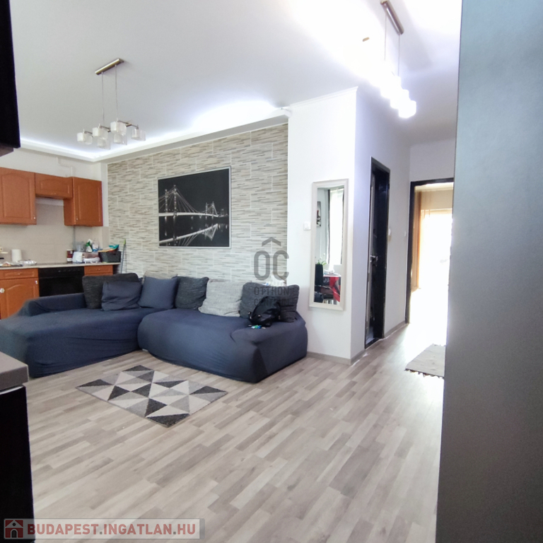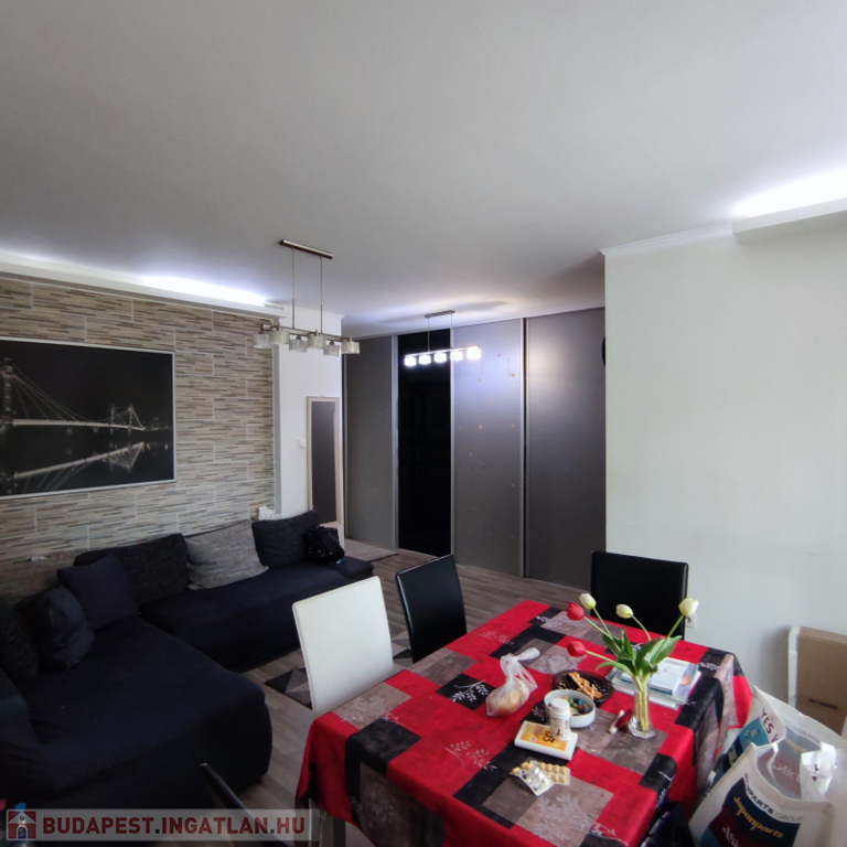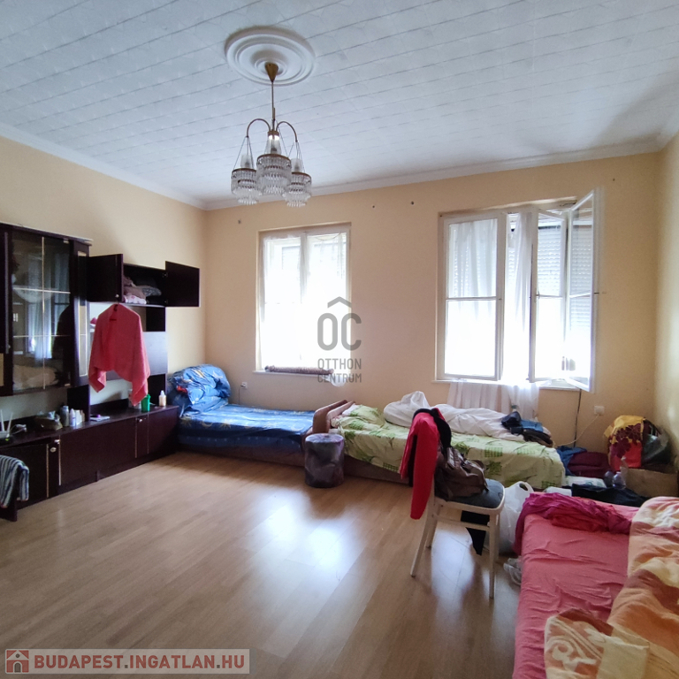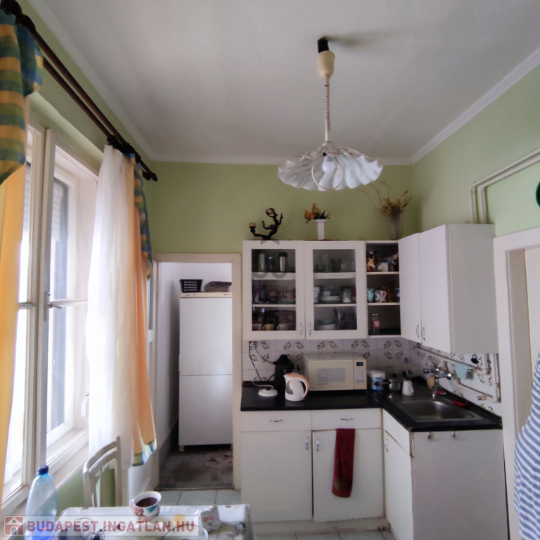 A felújított - de karbantartásra szoruló - lakrész az amerikai stílusú nappali a konyhával és az étkezővel egy légtérben található.