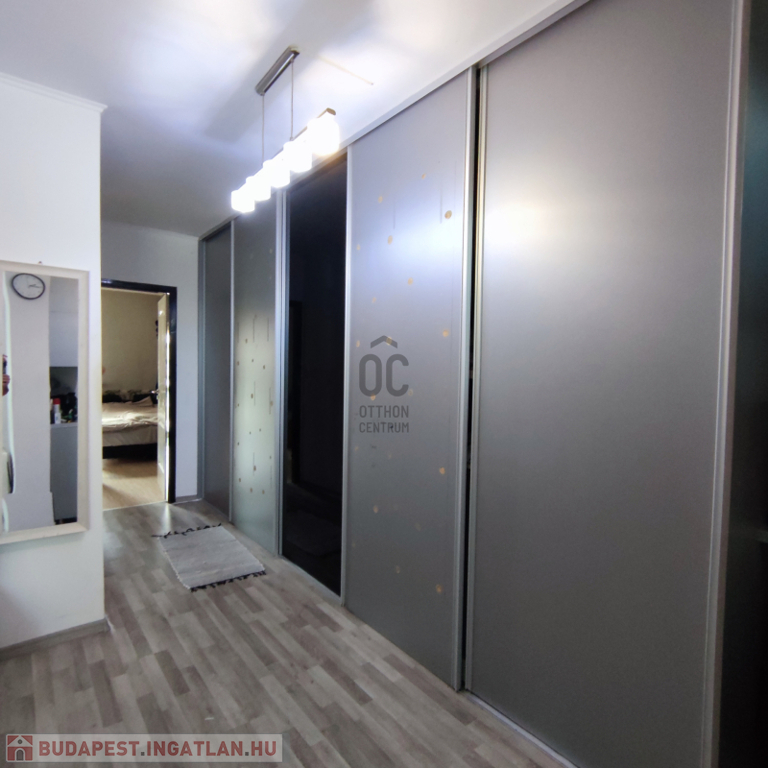 A közlekedőben nagyméretű, kiváló tárolási lehetőséget nyújtó, egyedi, méretre készíttetett beépített szekrény nyújt tárolási lehetőséget. További kettő szoba tartozik még a felújított részhez.