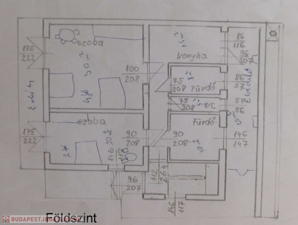 - földszint: lépcsőház, folyosó,tároló a lépcső alatt, 2 tágas szoba, fürdőszoba + WC, fürdőszoba, külön WC, erkély