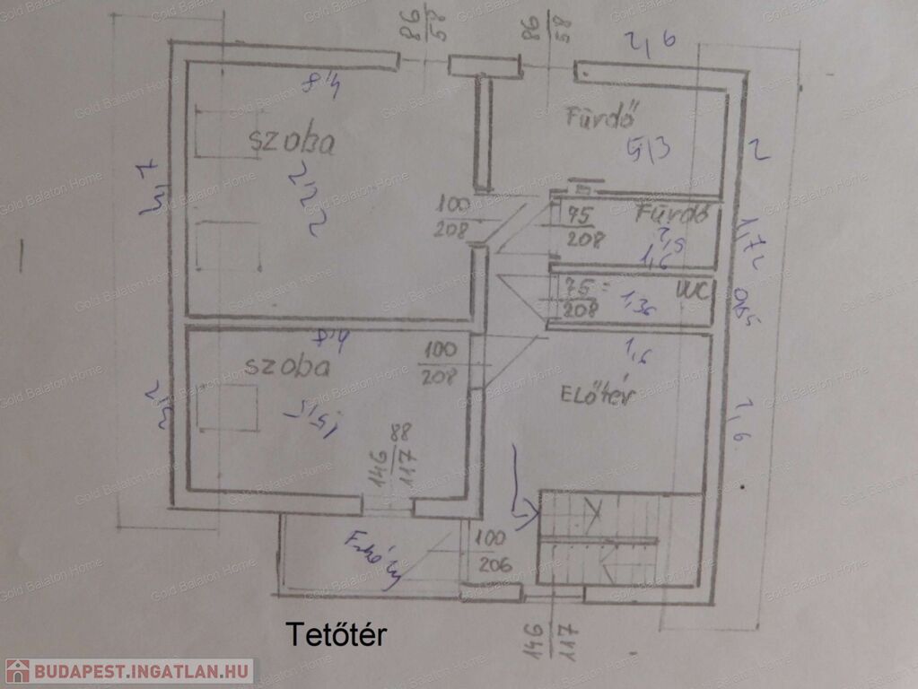 - tetőtér: előtér – társalgó, 2 szoba, fürdőszoba +WC, fürdőszoba, külön WC, erkély