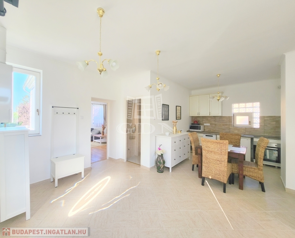 A családi ház kiváló elosztásából adódóan rendelkezésünkre áll egy tágas konyha - étkező, egy 25 m2 nagyságú nappali, mely 3 ablakkal rendelkezik, így nemcsak hangulatos életteret biztosít, de az állandó benapozottsága is garantált. Használhatunk további egy, külön bejáratú hálót, melyhez egy gardróbszoba is tartozik, valamint egy épített zuhanyzóval ellátott fürdőt.