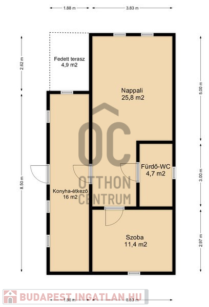 - Helyiségei: 2 szoba, étkező- konyha, fürdőszoba-WC, fedett terasz.