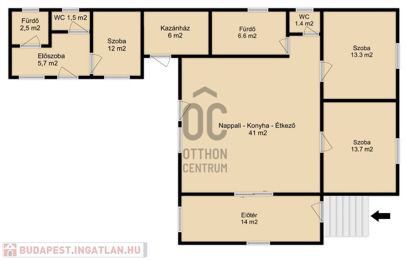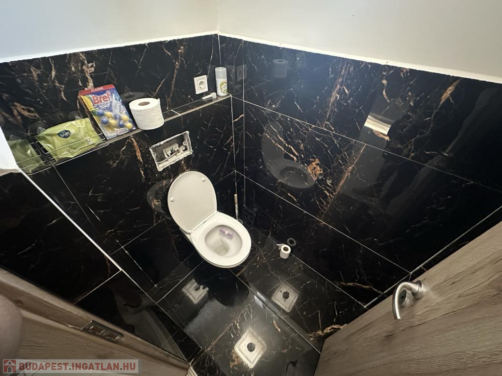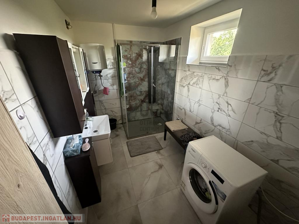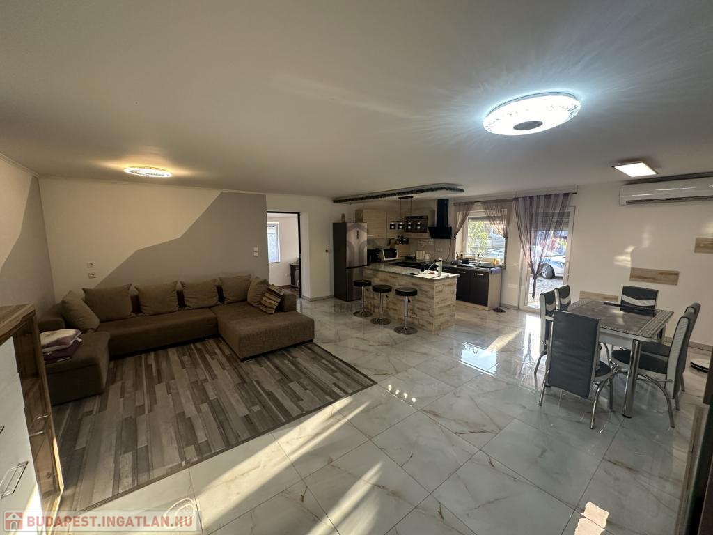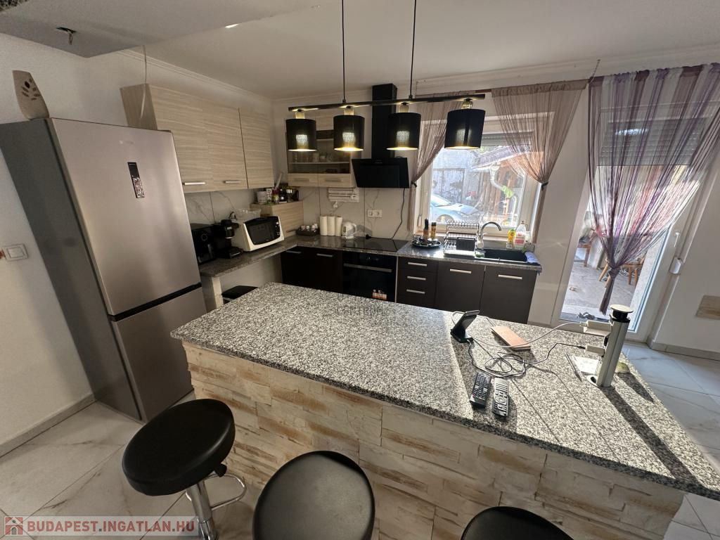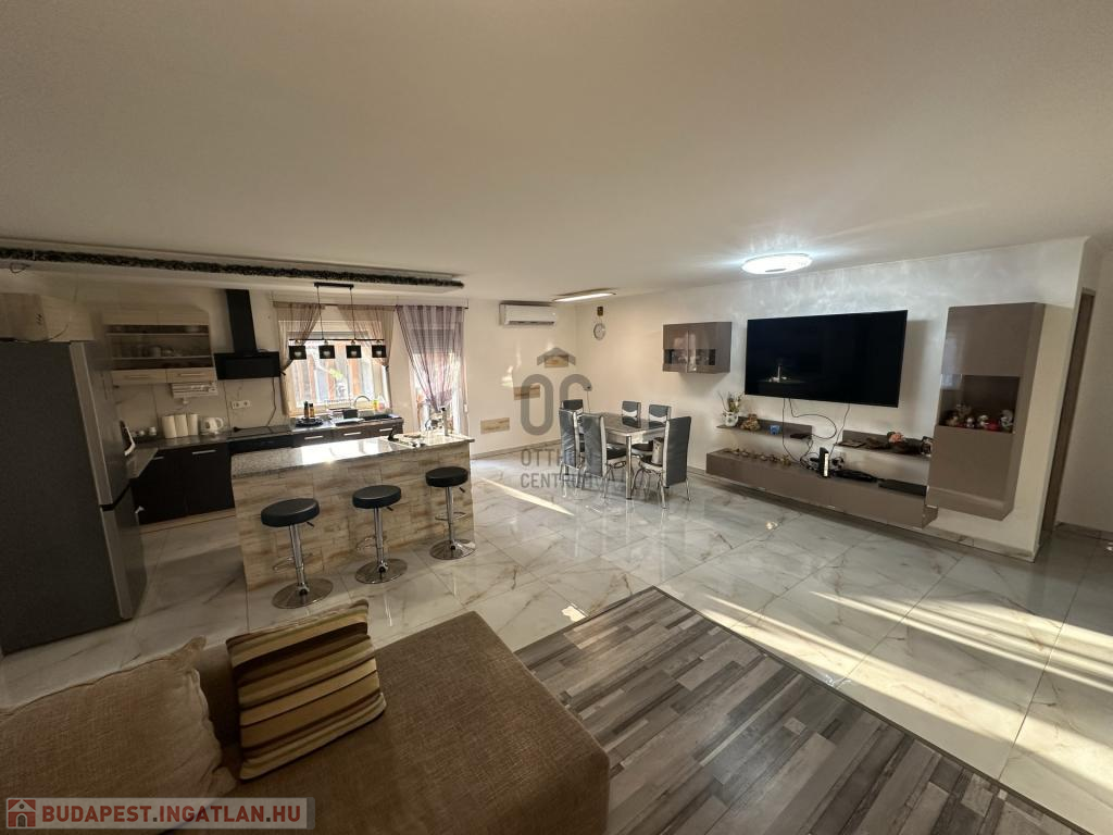 A burkolatok és a helyiségek elosztása a mai, modern igényeknek megfelelő, ezt az érzetet tovább fokozza az amerikai konyhás nappali.