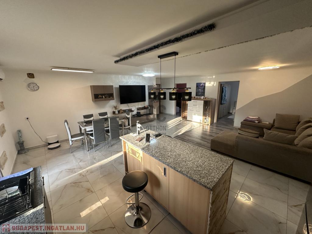 A burkolatok és a helyiségek elosztása a mai, modern igényeknek megfelelő, ezt az érzetet tovább fokozza az amerikai konyhás nappali.