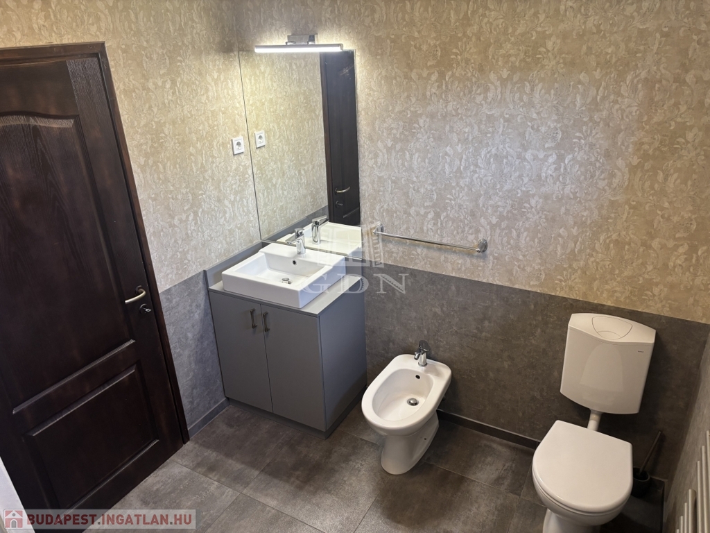 hálószoba, egy tágas közlekedő, mosó és háztartási helyiség, valamint egy kádas fürdőszoba (wc-bidet)