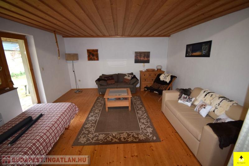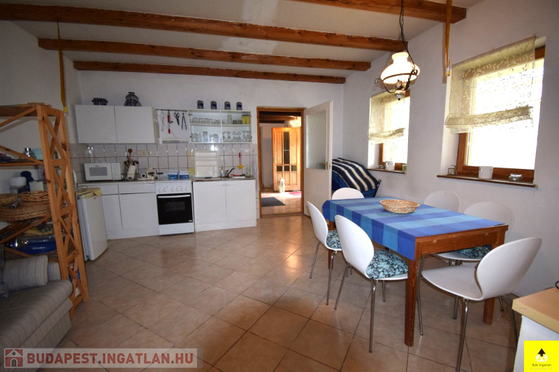 A klasszikus vidéki stílus és a modern kényelem harmonikus ötvözete jellemzi ezt az ingatlant. A 75 m²-es lakótérben két szoba, konyha, fürdőszoba és előtér található, a mennyezetet eredeti fa gerendák díszítik, meghitt atmoszférát teremtve.
