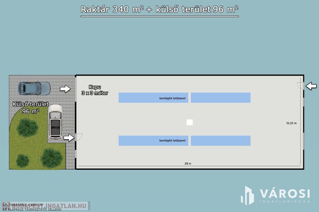 A raktárhoz tartozik az épület előtt található 96 m2 terület használati joga, illetve minden csarnokhoz jár parkolóhely is.