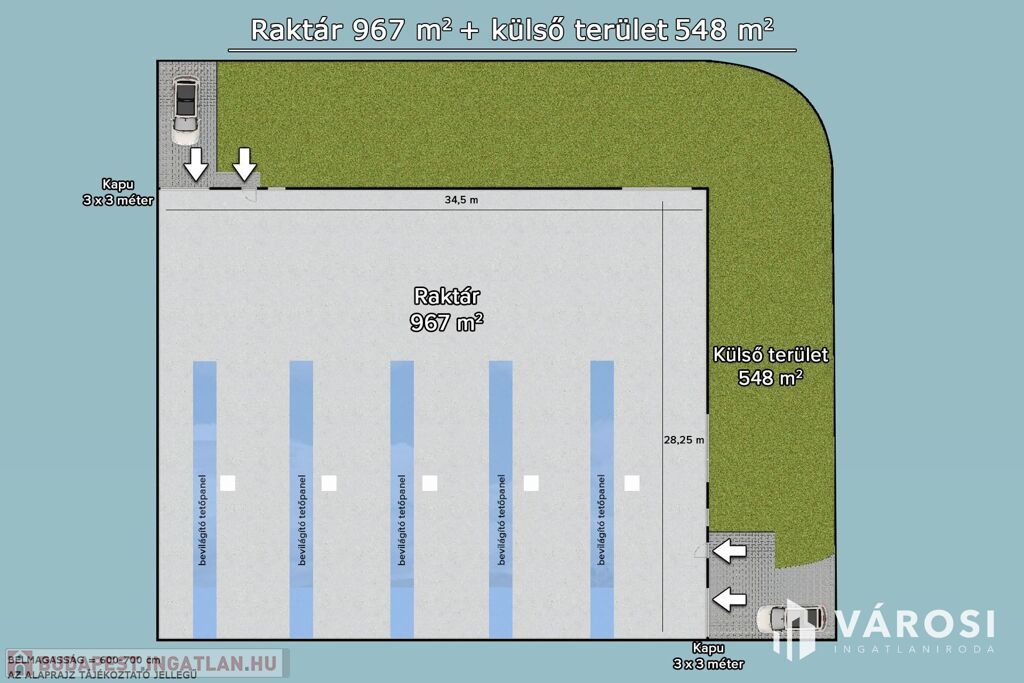 • A csarnok 2 oldalról megközelíthető, 2 oldalról rakodható 3×3 méter magas szekcionált ipari kapun