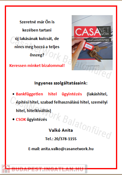 A CASANETWORK BALATONFÜRED ingatlanirodája eladásra kínálja a 2641