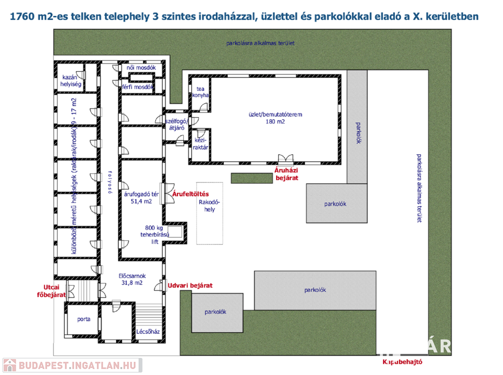 Az 1760 m2-es, körbekerített saroktelken két épület található: egy tégla építésű, 3 szintes, két emeletes irodaház, valamint egy 2014-ben ytong falazó elemekből épült 180 m2-es földszintes áruház/bemutatóterem.