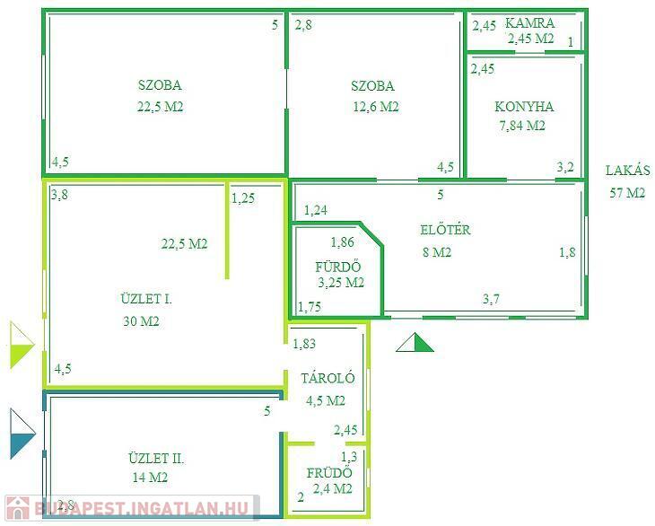 Téglaépítésű, 1 szintes, 2 utcai bejárattal rendelkező üzlethelyiség 15+30 m2-es. Tartozik hozzá egy 57 m2, felújítandó lakás, ahol konyha, 1+1 félszoba, fürdő és előtér került kialakításra. Egy 20 m2 tároló is rendelkezésre áll.