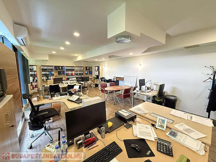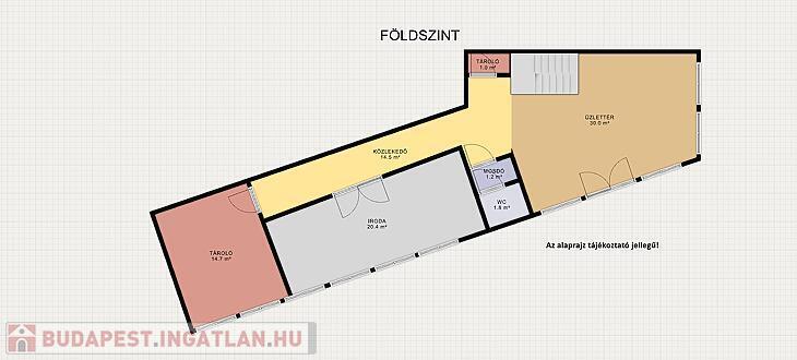 A magasföldszinten beérkezve egy üzlettér található konyhával és egy lépcsőház. Az emeleten, iroda fürdőszoba mellékhelyiséggel., A földszinten pedig 1 irodahelyiség 1 tároló és egy fürdőszoba.