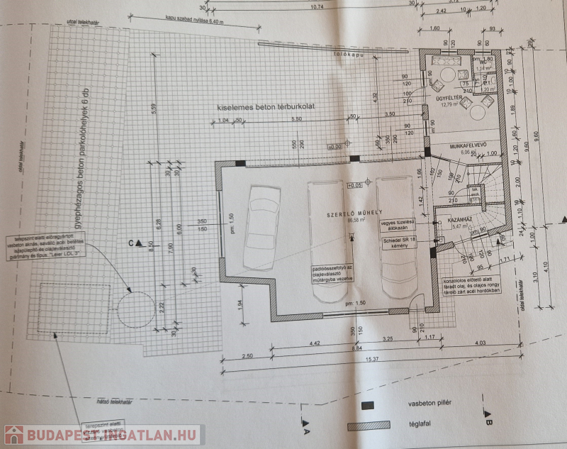 18. kerület forgalmas részén 224 m2-es, kétszintes, 3 állásos (2 emelős, 1 aknás) autószerviz, irodákkal, fürdőszobákkal, öltözővel, étkezővel, raktár helyiségekkel eladó. A 480 m2-es telken a műhelyen kívül még kb. 10 db. személygépkocsi fér el. Övezet: GKSZ2. Az emeleti étkező egy részéből iroda került kialakításra.